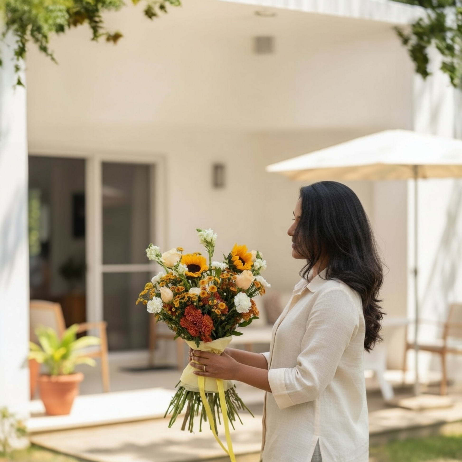 Brighten up your day with the Aura bouquet a zesty mix of yellow, orange, and white blooms that’s basically sunshine in floral form! Perfect for adding a splash of warmth to any space, it’s like a hug from Mother Nature herself (no awkwardness involved)! Just remember, flowers have their own schedule seasonal surprises await!