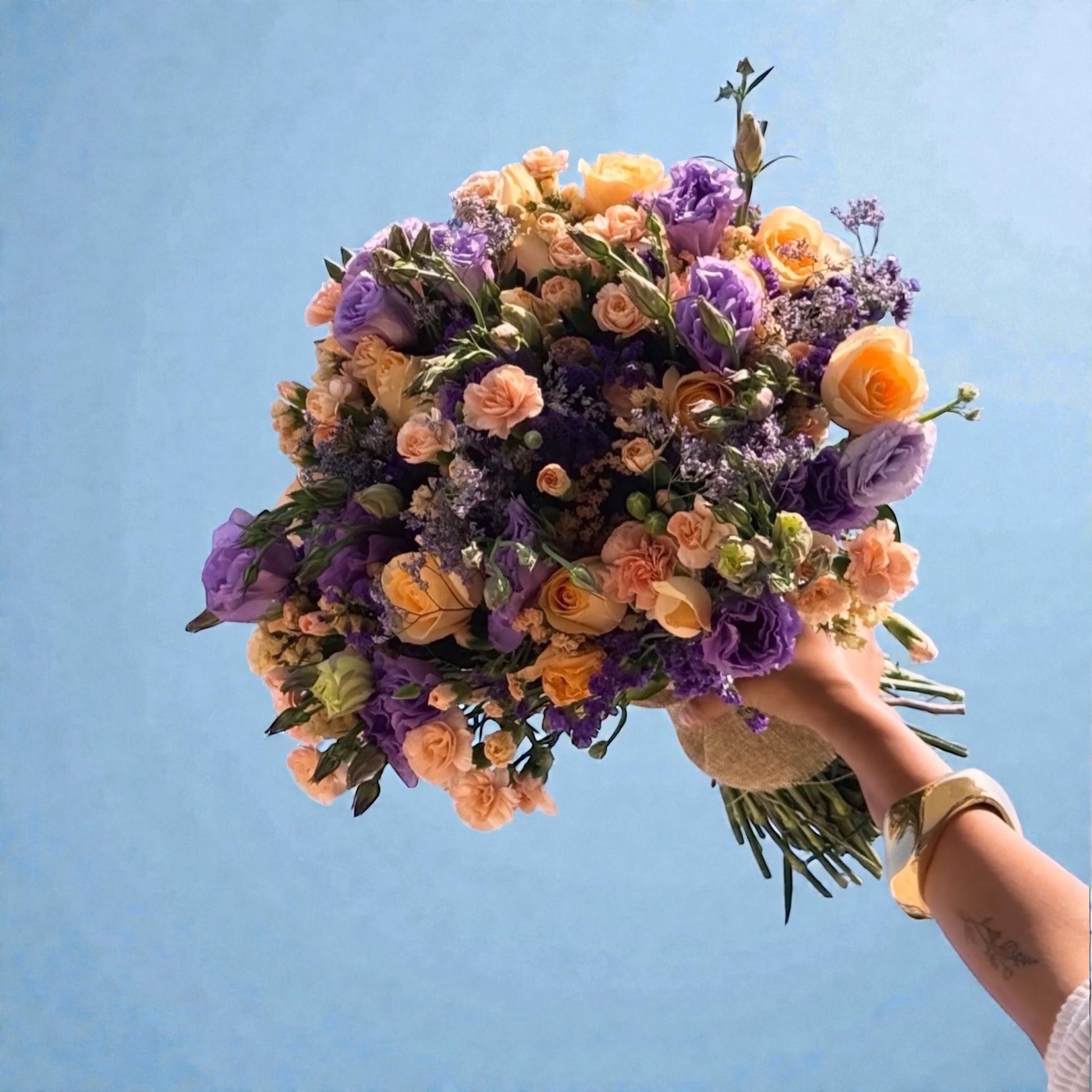 Daydream, whimsical floral concoction featuring a delightful combo of unique peach and purple blooms! These vibrant petals are perfect for brightening up your space or making any occasion feel like a garden party (sans the pesky bees!). Let your worries wilt away, one flower at a time!